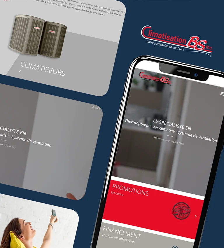 Site web corporatif pour un chef de file en climatisation et chauffage à Laval et sur la Rive-Nord. Avec plus de 40 ans d'expérience, Climatisation B.S. utilise sa plateforme pour présenter une vaste gamme d'appareils (Lennox, Mitsubishi, Gree) et ses services d'installation et de réparation. Le site est un outil clé pour la génération de prospects (soumissions) et la vente de filtres en ligne.