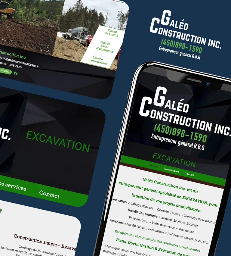 Conception d'un site web performant pour une entreprise d'excavation desservant la grande région des Laurentides. Le site est structuré pour mettre en valeur la flotte d'équipements et la diversité des services (résidentiel et commercial). Il met l'accent sur la conversion grâce à des formulaires de demande de soumission clairs et une présentation rassurante de l'expertise technique (installations septiques, drains français).