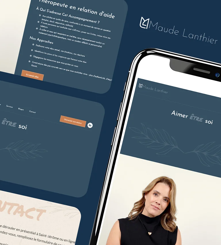 Maude Lanthier offre un service d’accompagnement psychologique essentiel. Le mandat était de créer un espace numérique qui reflète sa douceur et son professionnalisme (« Aimer être soi »). Le site devait être accueillant pour des personnes vivant potentiellement des moments difficiles.